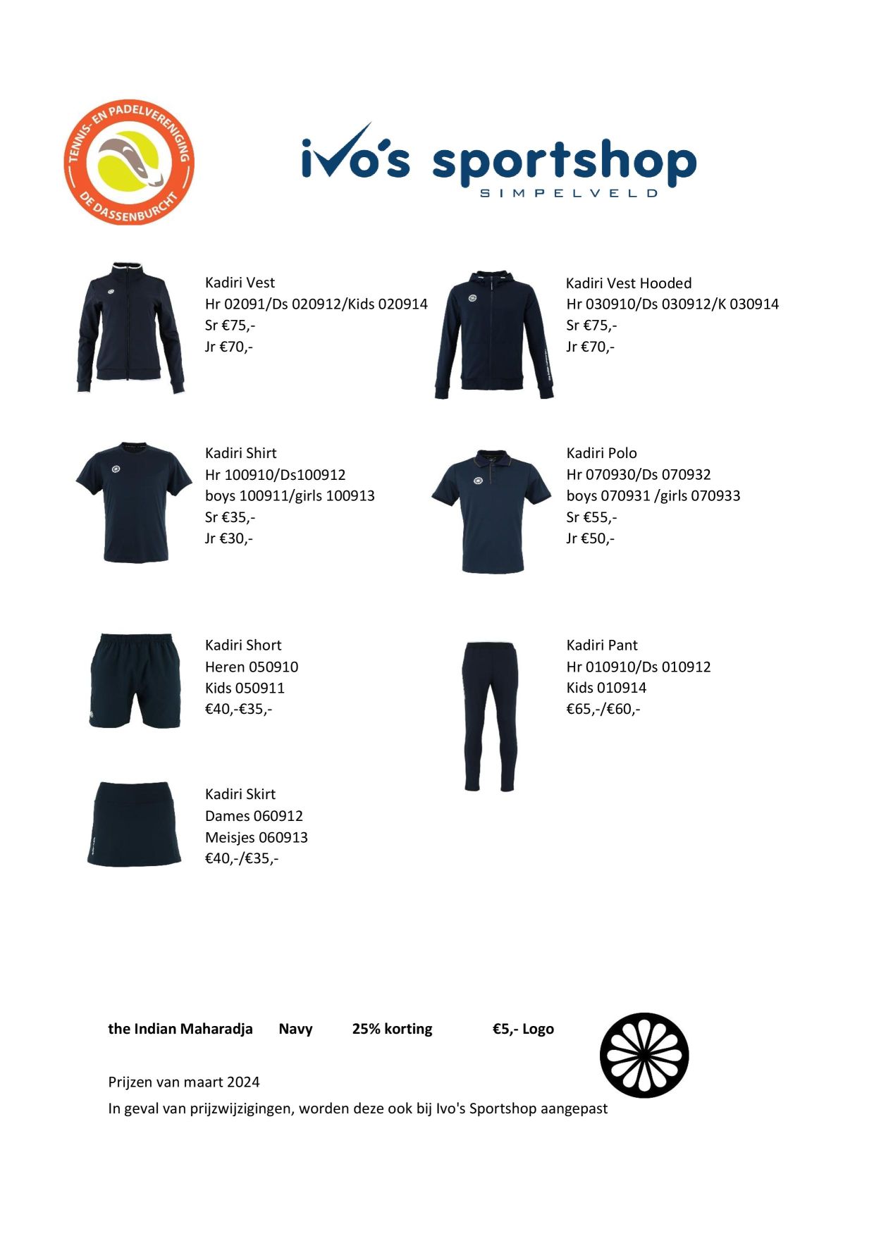 Kies voor de stijlvolle Kadiri-lijn van het merk INDIAN MAHARADJA in de kleur “NAVY”, met ons eigen TPV De Dassenburcht clublogo. Er is keuze uit dames-, heren- en kindermaten.