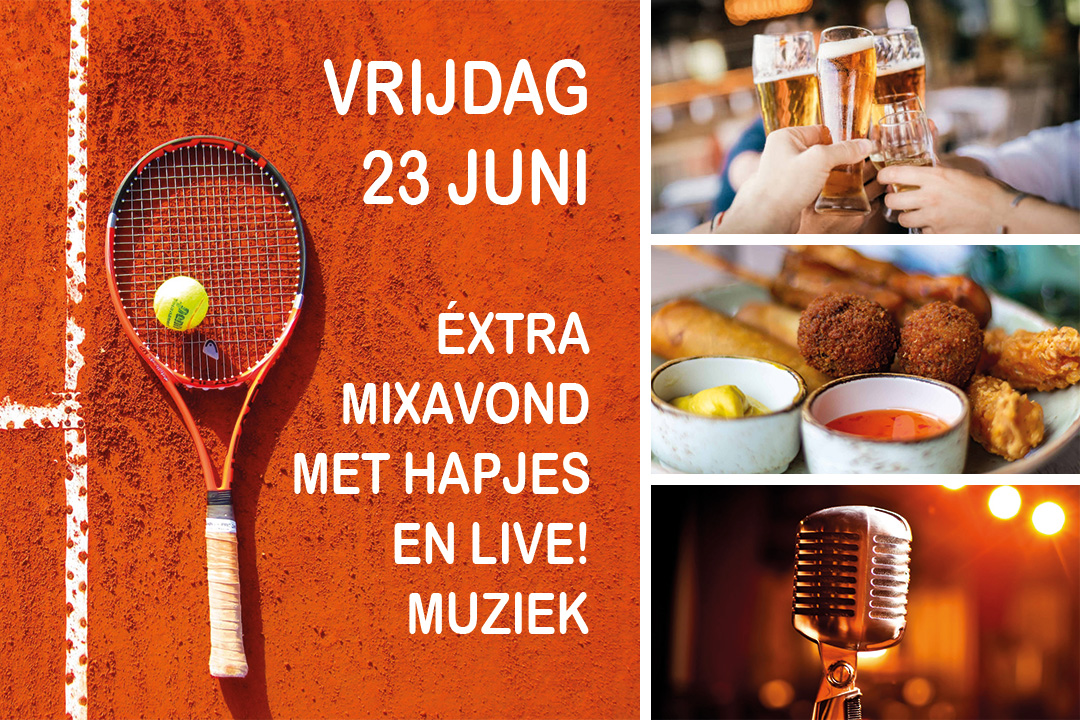 Vrijdag 23 juni organiseren we weer een speciale tennis mixavond. Deze gezellige avond staat in het teken van het tennissen met & tegen andere clubleden en waarbij de avond opgeluisterd wordt met hapjes en ook live-muziek. Schrijf je snel in want vol = vol! Aan alle aanmoedigers en supporters: ook jullie zijn van harte welkom, zodat we er samen een leuke avond van kunnen maken!